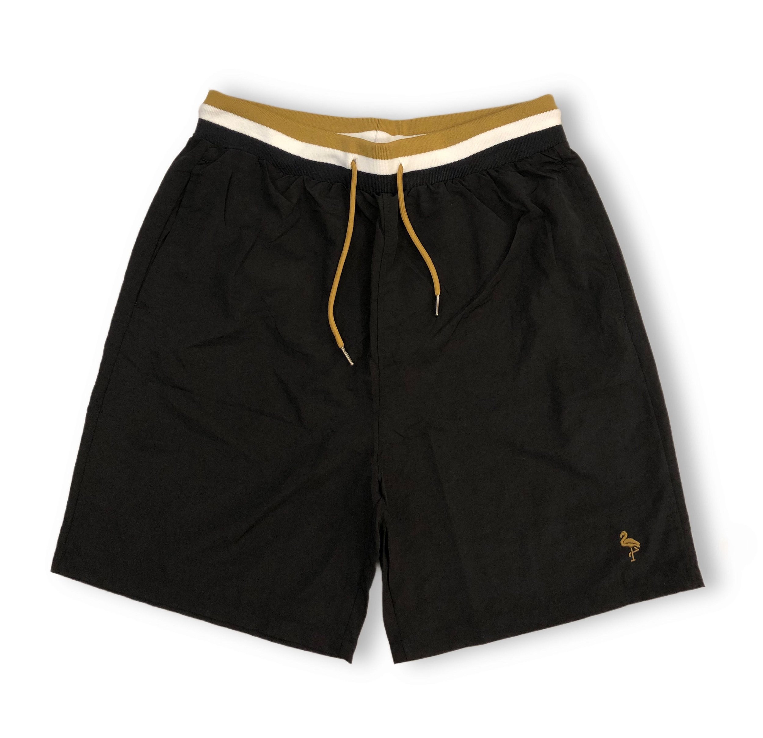 Cor predominantemente preta, com listras na cintura em cores, marrom branco e preto.